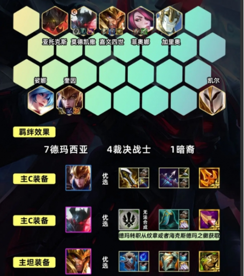 通过德玛西亚羁绊提供的光明装备强化前排坦度,结合裁决战士的暴击加成实现快速收割。铁男携带转职道具后可同时享受双重羁绊加成,成为兼具输出与生存的主C单位。