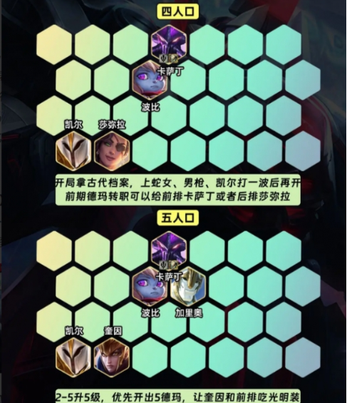 2-1阶段升至4人口,采用德玛体系过渡,转职道具可暂交卡萨丁(前排承伤)或莎弥拉(后排输出)。2-5阶段升级5人口,优先激活5德玛羁绊,使奎因与主坦单位获得光明装备加成。