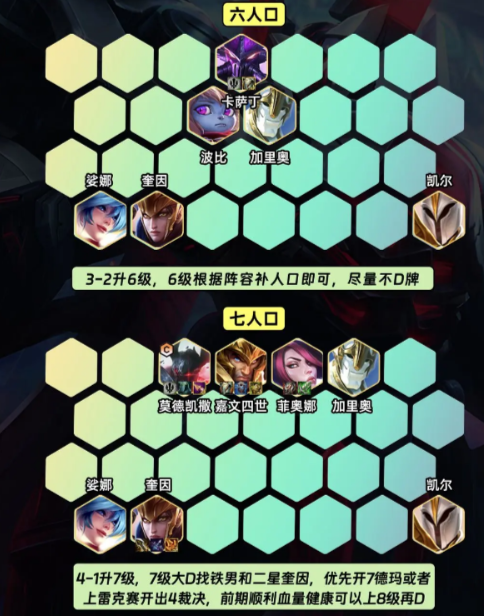3-2阶段升至6人口,根据战场形势补充羁绊单位,此阶段建议保持经济优势避免过早搜卡。4-1阶段升至7人口后启动核心搜卡,重点获取铁男与二星奎因,根据转职情况选择7德玛2裁决或5德玛4裁决阵容架构。