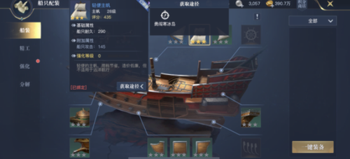 配件分解功能可将紫色品质装备转化为精工核心材料,分解橙色配件额外产出突破催化剂。需特别注意已装配的船首像不可直接分解,必须替换为备用装备后方可操作。建议保留三套不同属性的船尾配件以应对不同战斗场景。