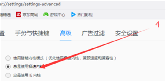 4、在高级设置面板的网页渲染模块中,勾选"始终采用极速内核"单选按钮,此操作将强制浏览器统一使用Chromium内核渲染所有页面。